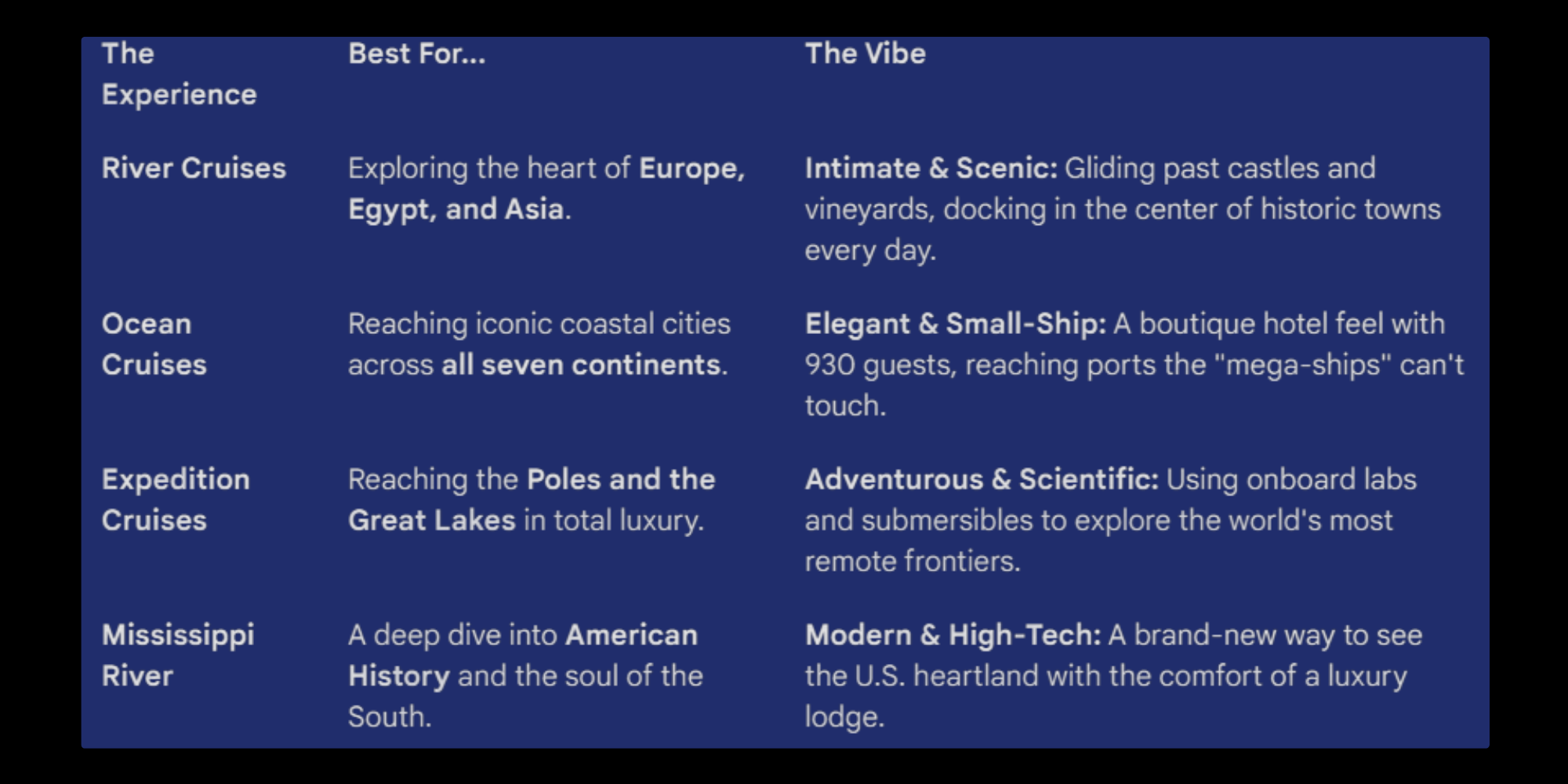 The Ships: While the "Mega-Ships" are destinations in themselves, Viking ships are designed to be understated backgrounds for the destinations you are visiting. With fewer than 1,000 guests on their Ocean ships (and fewer than 200 on River ships), you’ll never deal with the crowds or queues found on larger vessels.